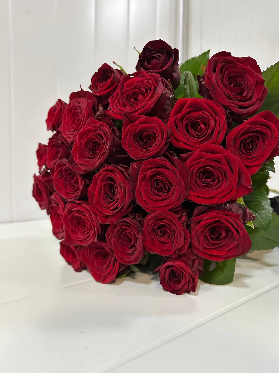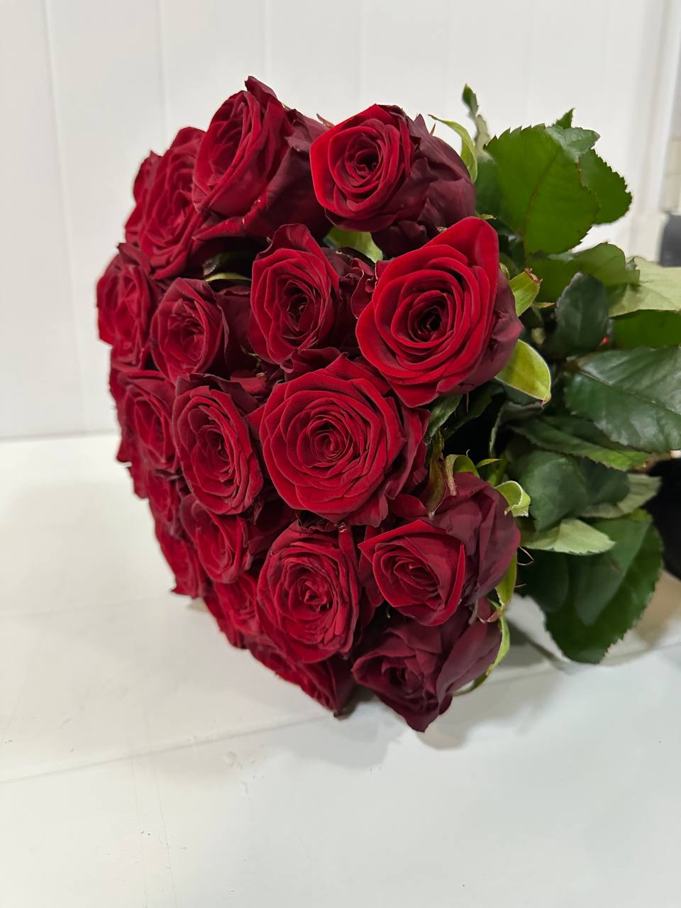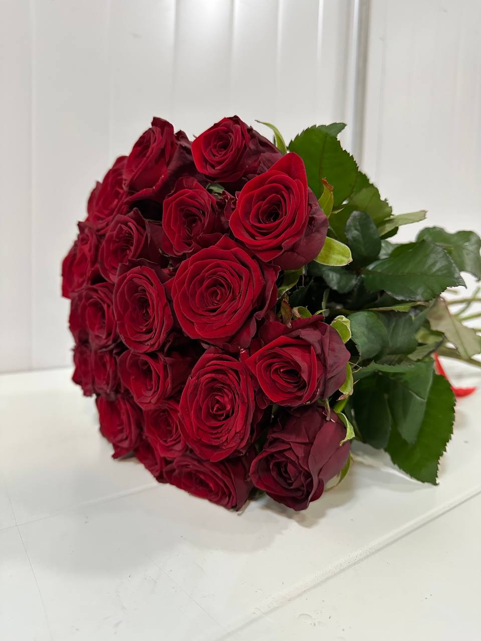 25 бутонов создают объёмную, насыщенную композицию, которая производит яркое впечатление. Насыщенный цвет символизирует сильные чувства, преданность и восхищение.